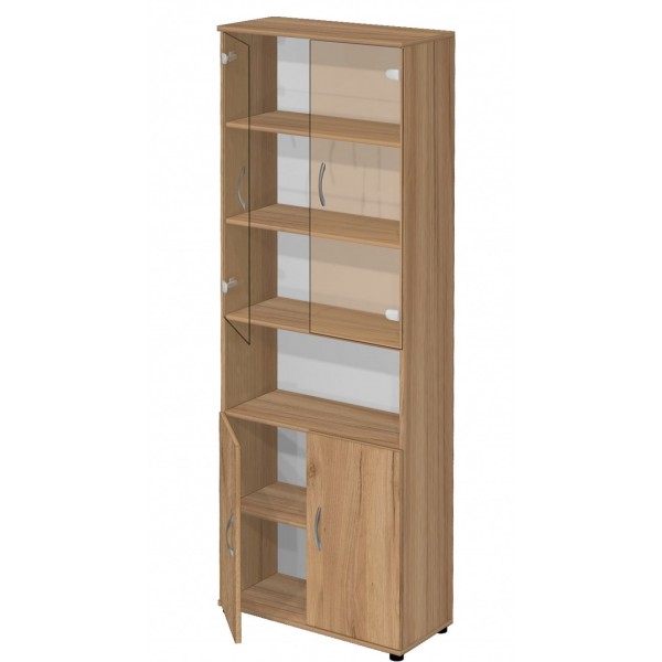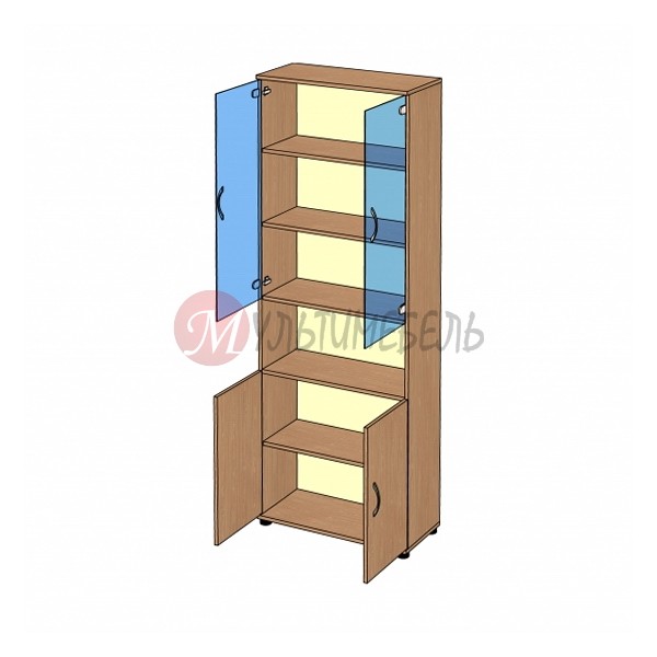 Шкаф для документов полузакрытый со стеклом B-42.22.12 выполнен из ламинированной ДСП толщиной 18 мм. кромка ПВХ 0,5 и 2 мм. Используется импортная фурнитура. Дно шкафа имеют полимерные регулируемые опоры (для большей устойчивости), предотвращающие повреждение напольных покрытий.